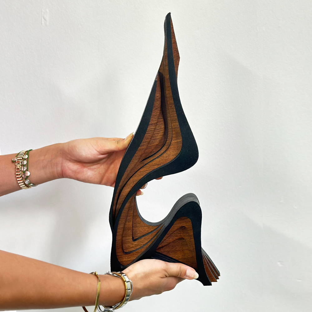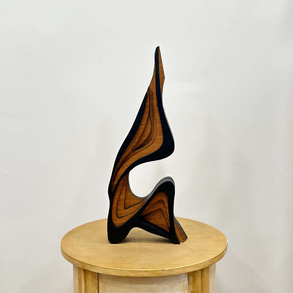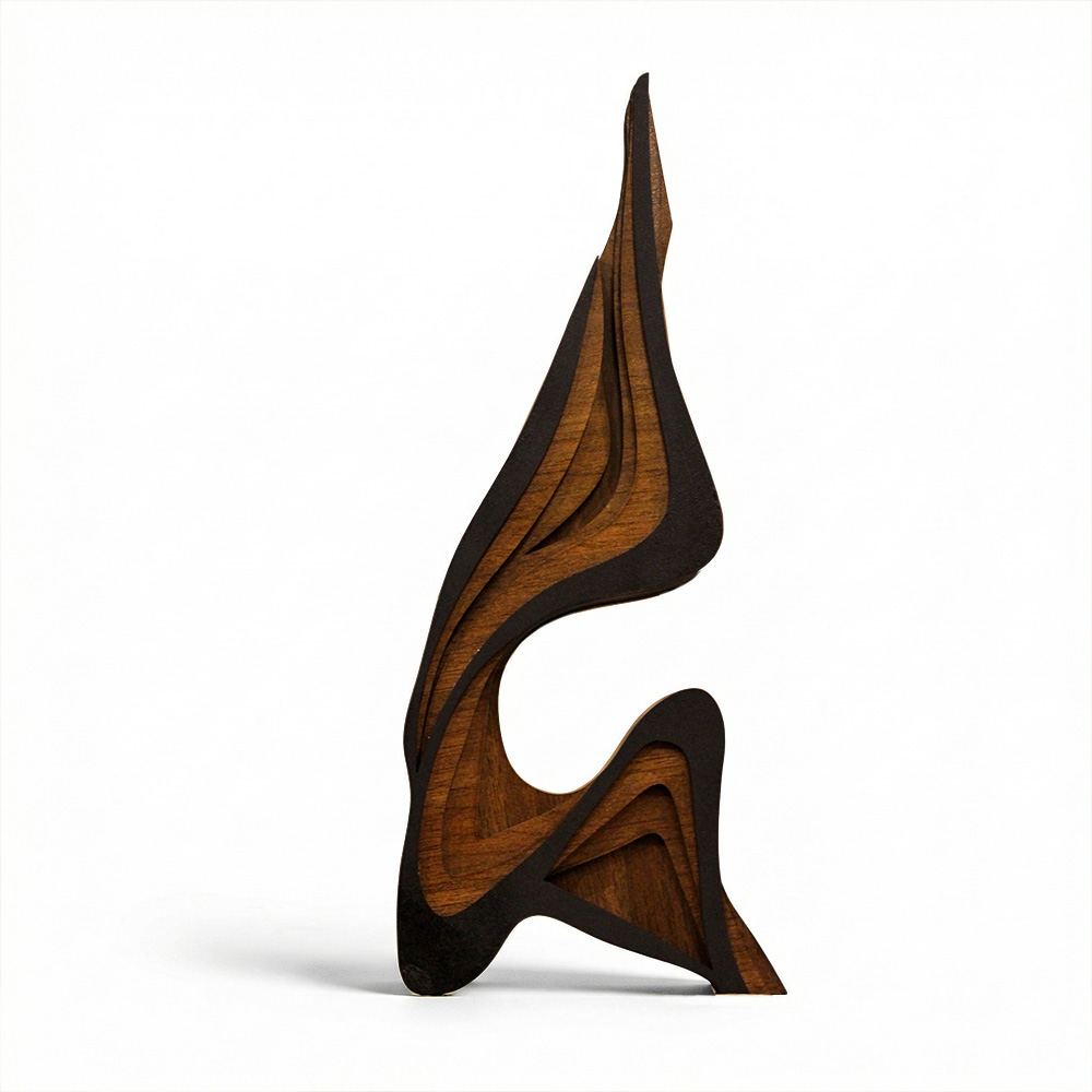 Ballerin, adını taşıdığı hareketten ilham alır; yukarıya doğru yükselen sivri form ve aşağıya doğru kıvrılan tabanıyla tam bir denge ve teslimiyet hissi yaratır. Organik çizgilerin ve akışkan katmanların bir araya geldiği bu ahşap biblo, soyut sanat anlayışının en saf ifadelerinden biridir. Her açıdan farklı bir siluet sunan Ballerin, masanızda ya da rafınızda durduğu her an mekânınıza anlam ve derinlik katar.